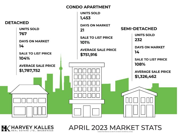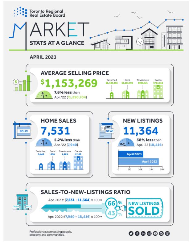 The Toronto Regional Real Estate Board (TRREB) has published its sales data for April 2023. With 7531 home sales reported through the local MLS, transactions were down 5.2% year-over-year.